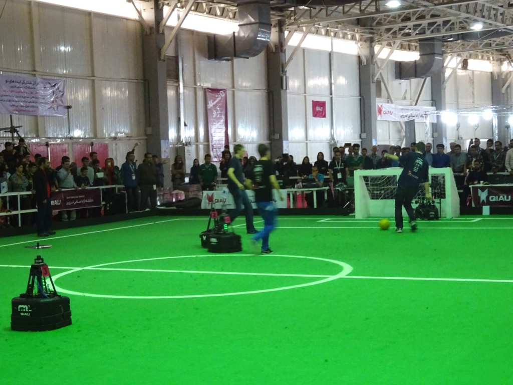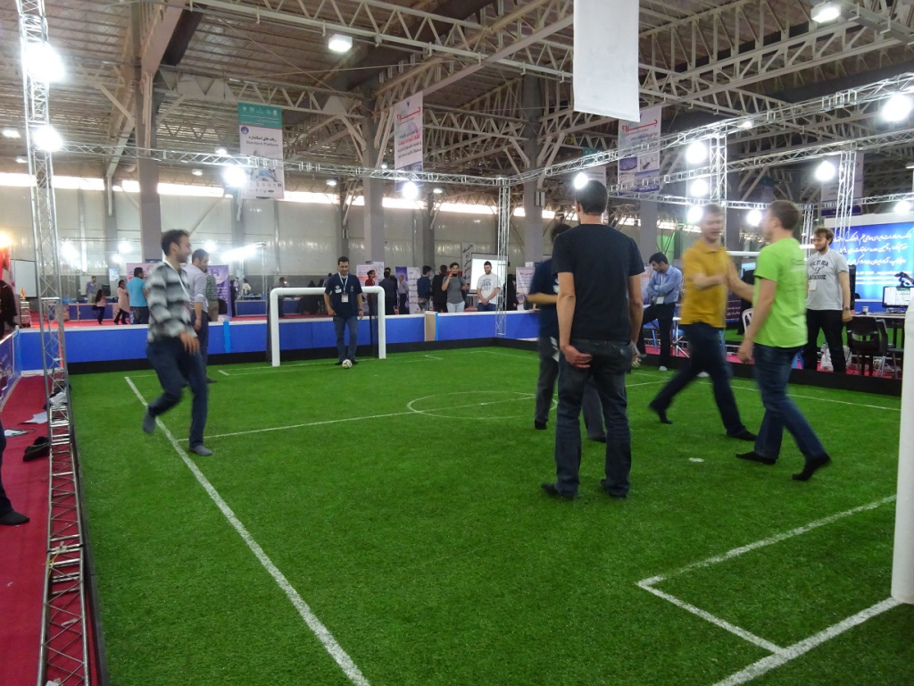 In der Mid-Size League waren nur zwei Teams angemeldet, von denen nur das MRL Team auch antrat, denn das Andere hatte, wie uns erzählt wurde, keine Ausreiseerlaubnis in ihrem Land bekommen. So blieb genügend Zeit dass wir ein mal gegen die Roboter von MRL antreten konnten. Für unsere Roboter selbst wäre das viel zu gefährlich, aber bei den Menschen aus unserer AG sieht das natürlich anders aus (dafür hat man ja den Auslandsreisekrankenschutz…) und so traten kurzerhand vier unserer Teammitglieder gegen vier Roboter aus der Mid-Size League an.